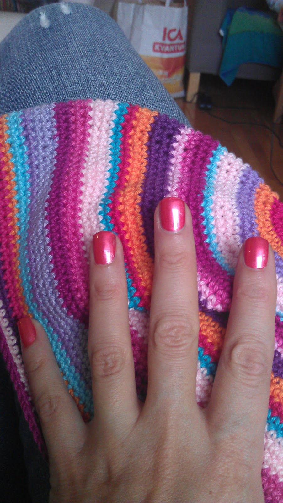 Mitt korallack kände sig revanschsuget efter gårdagens bleka bilder och svidande kritik ;) Så därför ville det bli fotat ihop med min senaste virkkreation. En färgglad mössa som matchar koralltonerna fint.